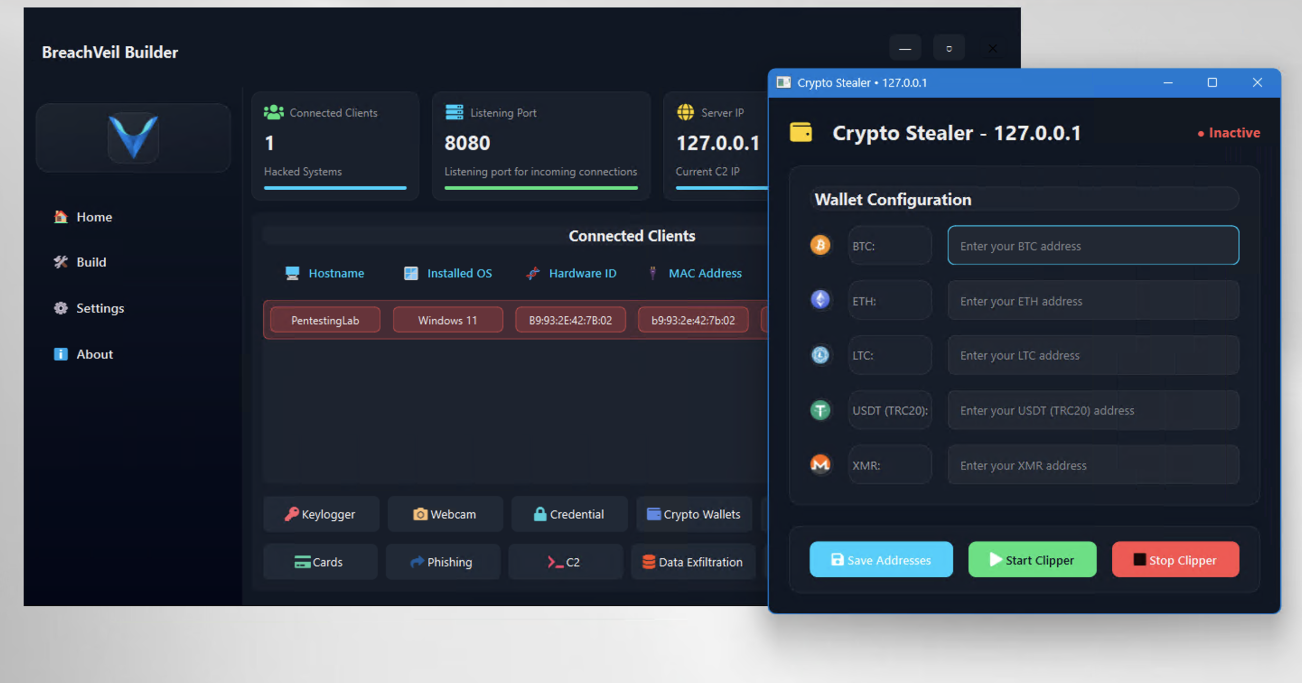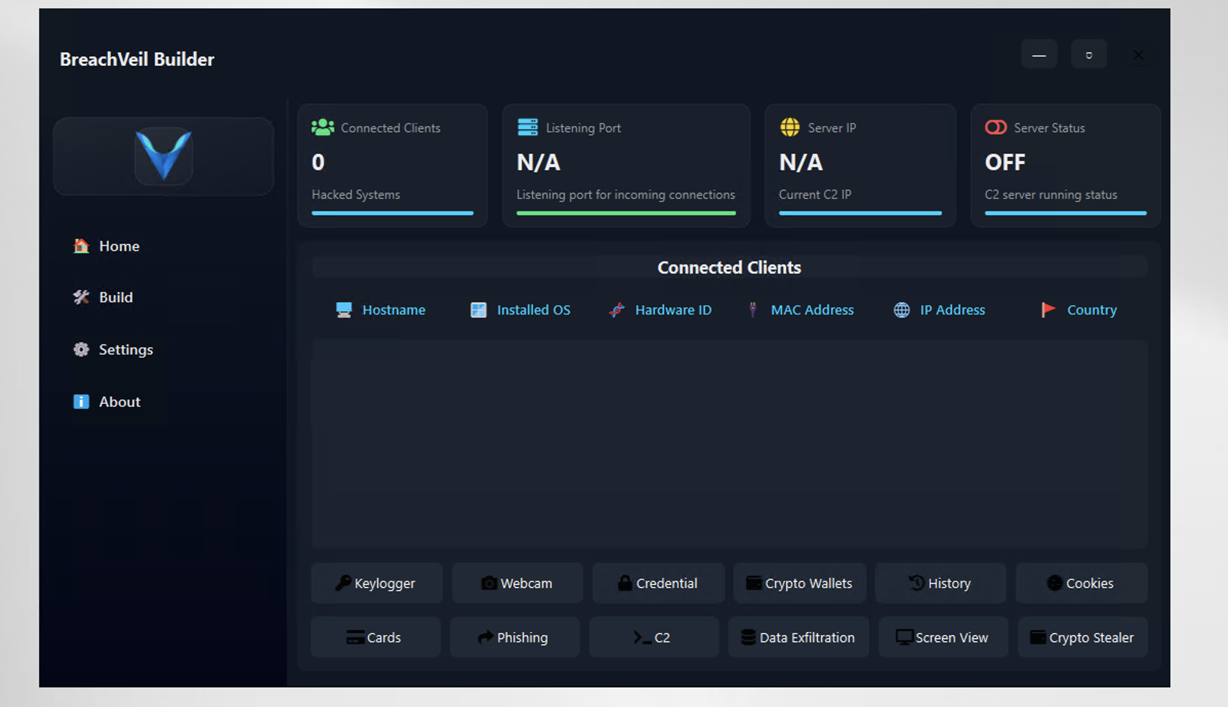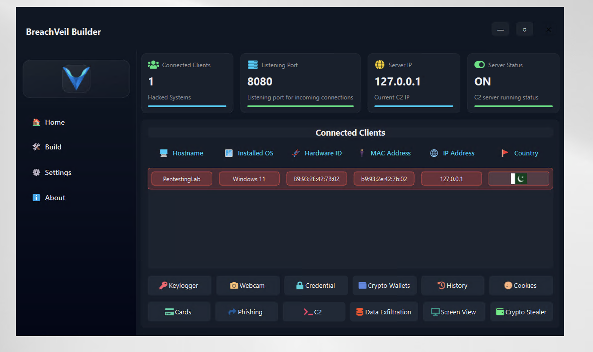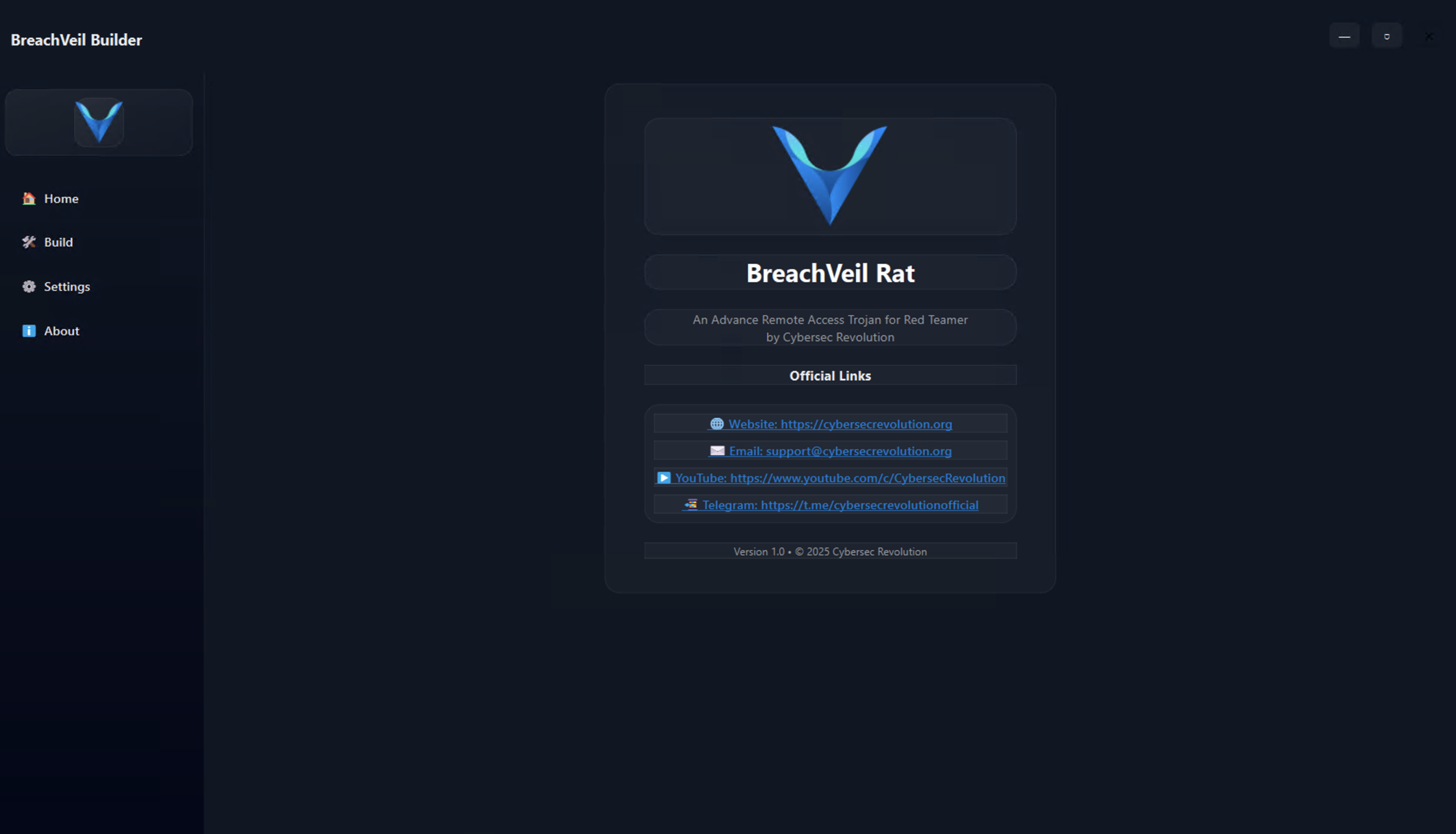 BreachVeil Rat v1.0 is a state-of-the-art, fully undetectable tool designed for epenetration testing and red teamer. BreachVeil is a sophisticated, all-in-one Remote Access Trojan (RAT) desgined for comprehensive system intrusion. Built with a modern, intuitive interface, it provides unparalleled control over compromised systems.